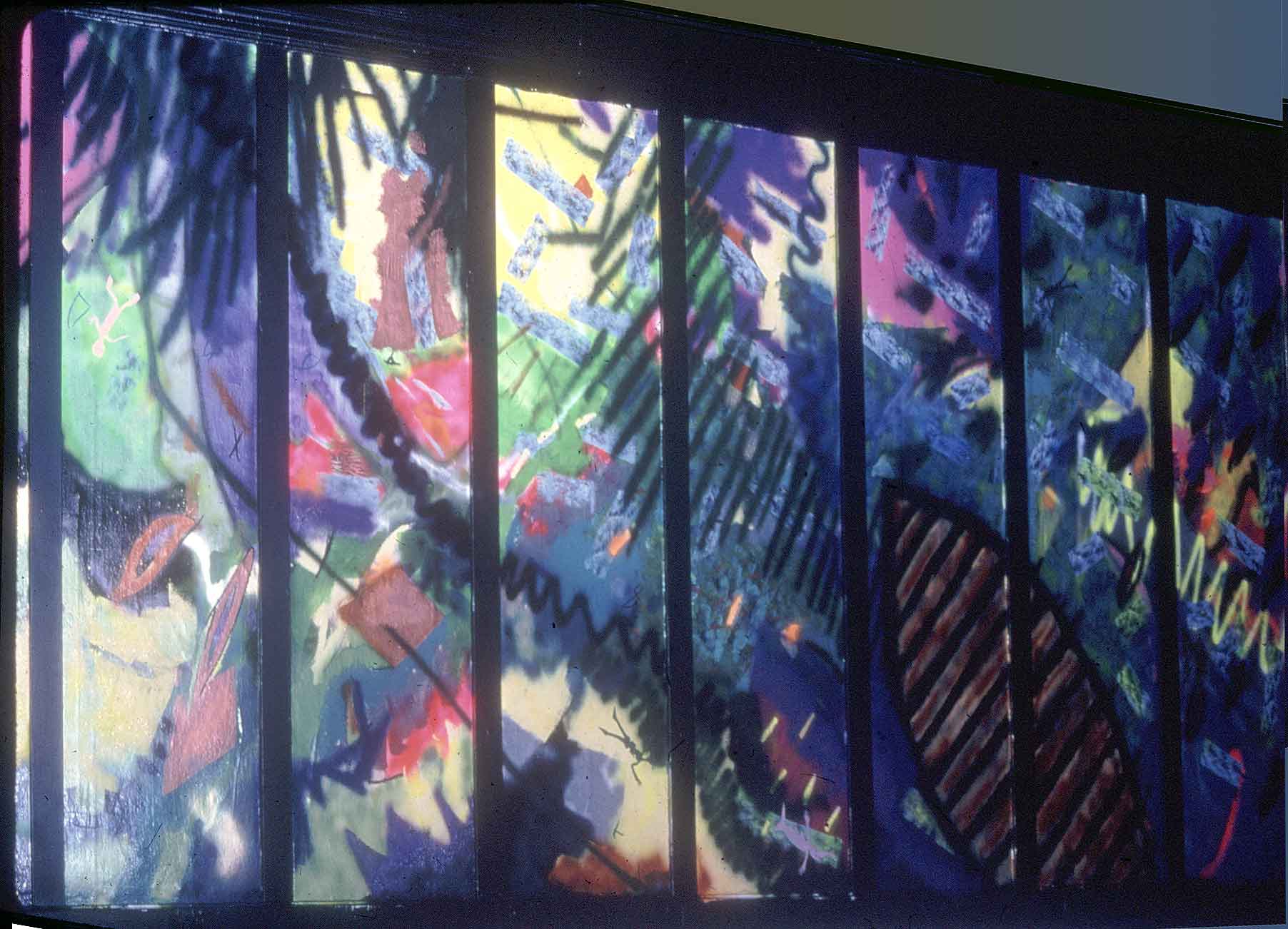 By 1983 I got the opportunity to remake the second floor lounge and so I conceived “The Alien Lounge”, a large room on the second floor of the building with an adjacent kitchen. Because of no cash being available for the materials I decided to paint twenty three panels on vinyl, each panel was pre sold like stock. I numbered the back of each panel randomly and as agreed at the end of a three year period the panels would be removed and given to the corresponding stock numbers. I was able to sell all twenty three panels this way.
