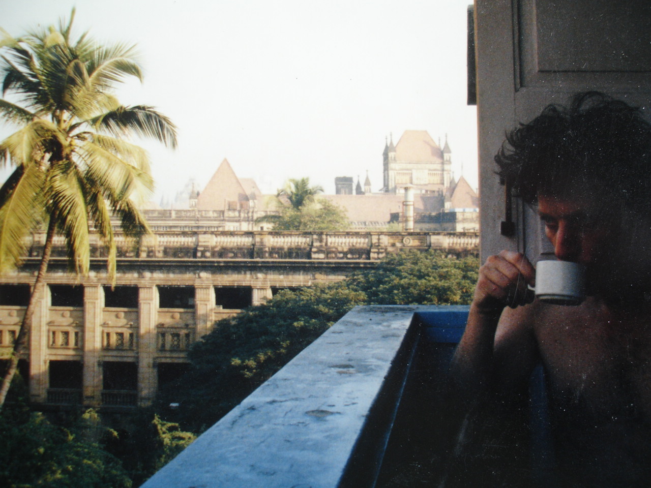 Decided to get ticket for Goa, got up early and went out to buy goodies for Goa. Mosquito coils, candles, incense, stuff you know, well that was ok. Hot hot hot. and then we went to post office, the library to do research, bought a bootleg Kraftwerk tape and Rajastani shoes for Bean. Came home at 2:30 from the Leopold to hear that Americans had been requested to leave India. America was shutting down everything, remember this is day five of the Gulf War, we left Toronto in the early hours of the start of the Gulf War, at night you can see the night sky light up in the west. How is it possible? Now I remember the night before, when a truck load of Moslems rode by shouting long live Saddam Hussein, Also, late this evening saw an owl very close up that kept me mesmerized for a while. It was very large and sitting on rafters above doorway in Colaba. Owls always alert me that I should pay attention to my surroundings and tread carefully. So we decided to stay in Mumbai where things seemed cooler, and we moved into a new room at the YWCA, a very large room with two balconies.