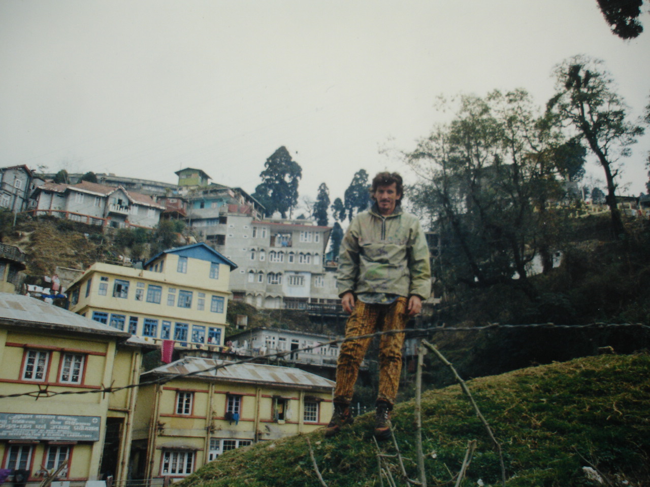 Then went to the other side of the mountain for clothing drying in the tall grass and letter writing, sketching and sleeping in the sunlite. Later we did the rupe exchange on the BM for extra cash. In the evening we went for a typical Nepali meal, a pungent non exotic, non Indian meal with basic dahl and rice, on the way home at Observation Hill we were treated to a pan, by the pan man. It was a cool blustery night as we watched him make it, taking a beetle leaf and smearing it with tar like goo, then laying lines of spices and beetle nut shavings, then looking up and smiling and putting other mystery ingredients none of which I could identify. It took a lot of chewing and struggling not to have it pop out of my mouth out onto the street. After twenty minutes of hard chewing I was still trying to break it down, I don’t think my teeth could benefit from the continued use of pan. It was interesting and enjoyable but nothing I would go searching for. In the afternoon we went to the Himalayan Mountaineering Institute to get maps and information on treks, we also bought some badges.