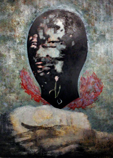 Peak Oil is a representation of the Lucas Gusher at Spindletop Salt Dome in Beaumount, Texas, January 10th 1901. This gusher marked the beginning of the Texas oil boom, there was so much oil found at Spindletop that by 1914 gas was selling at 3 cents a barrel. In the painting a large sky face to the right glances down furtively as if knowing where this road leads. The left side of the canvas reveals what appears to be stacks of skulls.
