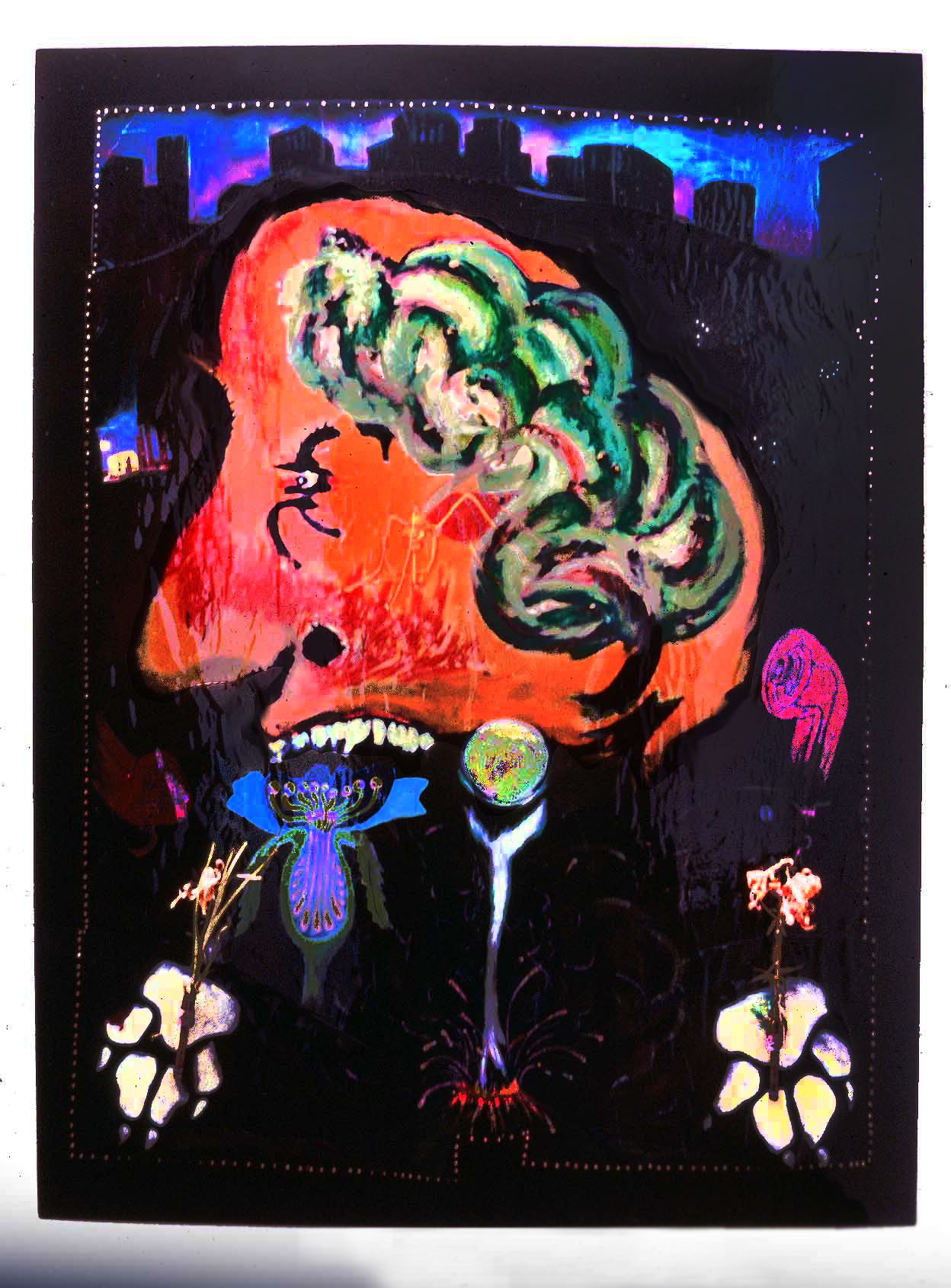 In this work we see the caboshed head of Mussolini in a rage as his cheek is being sucked of blood by an enormous mosquito.  He is screaming into a telephone with a broken line, and another by his ear, his brain is represented with a broken oak tree, which has real acorns embedded into the panel. The city outline at the top of the painting is taken from a fascist medal which was given to me by a friend in Rome with the instruction to destroy them; which I did by going to Naples and throwing them into Vesuvius. The Duce is  looking at a postcard of Rome, at the bottom two wolf paws are open with two stigmata points which are holding a copper tube presenting fresh daylilies. At the bottom you can see an erupting Vesuvius with the medal above.  The patriarchal brain chomps down on a vivisected flower in it’s rage in it’s inability to connect or affect control over it’s environment.